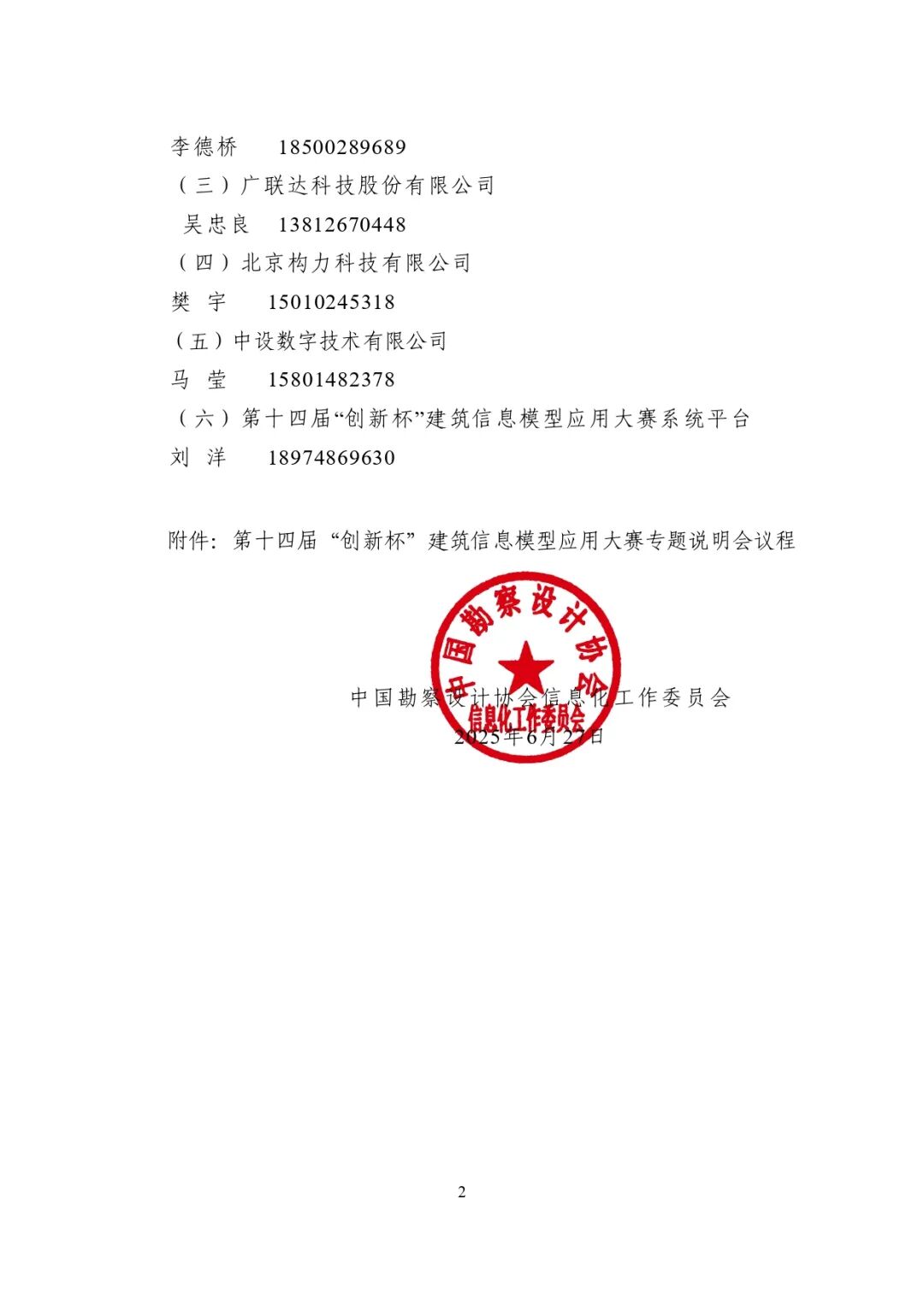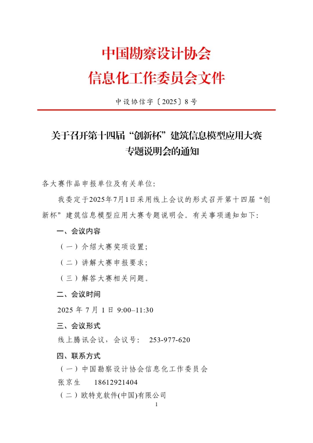 为帮助各申报单位对奖项设置、申报要求等有更加全面清晰的了解,中国勘察设计协会信息化工作委员会将于2025年7月1日9:00-11:30采用线上会议形式召开大赛专题说明会,各申报单位可通过腾讯会议参加,会议号:253-977-620。