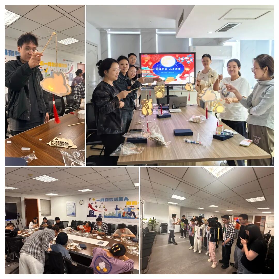 苏州研发中心于9月25日在大会议室开展中秋活动。“巧手制灯”环节,利用木质灯笼架、明艳宣纸等材料,员工或独立构思、或互助创作,有人在灯面绘中秋诗句添文化韵,有人折立体彩纸花纹显巧思,尽显苏州分公司独有的细腻与雅致。